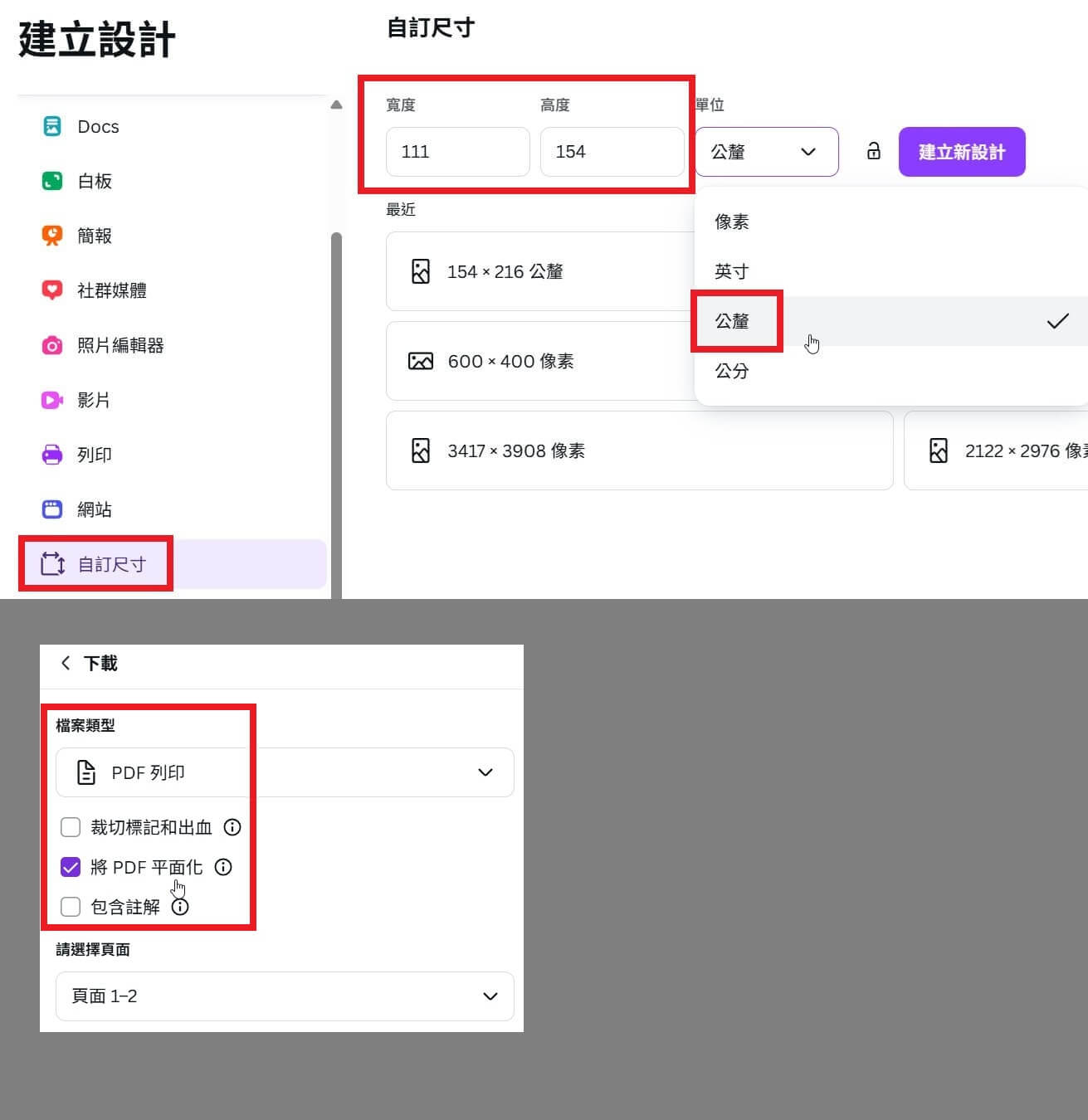 設計完之後,點『檔案』→→ 下載 →→ 檔案類型選「PDF列印」,請注意:『將PDF平面化』要打勾,其他不勾(點下圖可看大圖),再下載檔案。