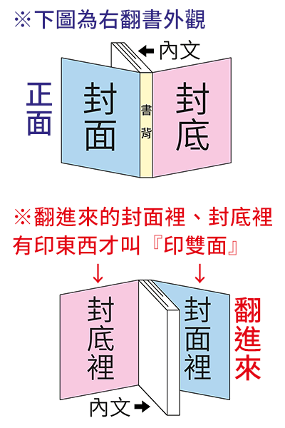 相反地,封面通常只印(朝外的)正面,(翻進來的)背面空白不印——這叫『單面印刷』。
