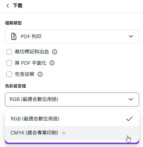 6. 如果是用Canva做稿,只有在存成PDF時(如圖)才能選CMYK色域,而且是付費版。