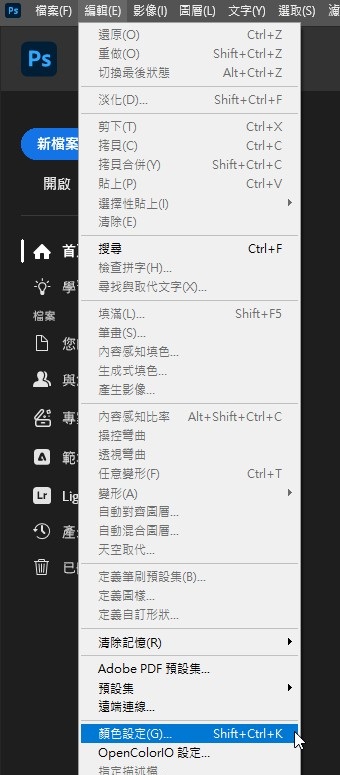 先從這裡下載我們做好的色彩設定⮕開啟Photoshop⮕點上面的「編輯」⮕點「顏色設定」(如圖)⮕點「載入」,選剛剛下載的檔案⮕按確定就可以。